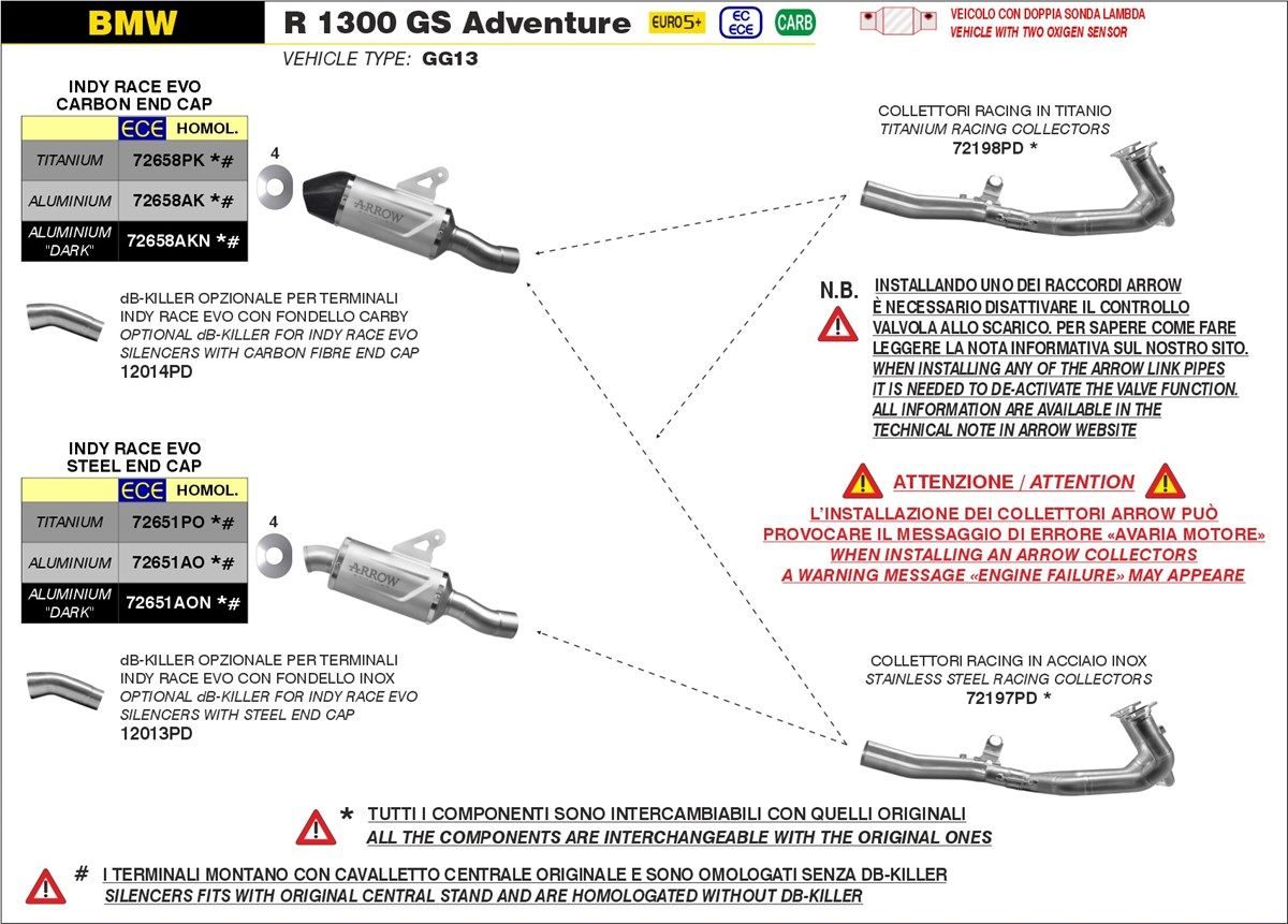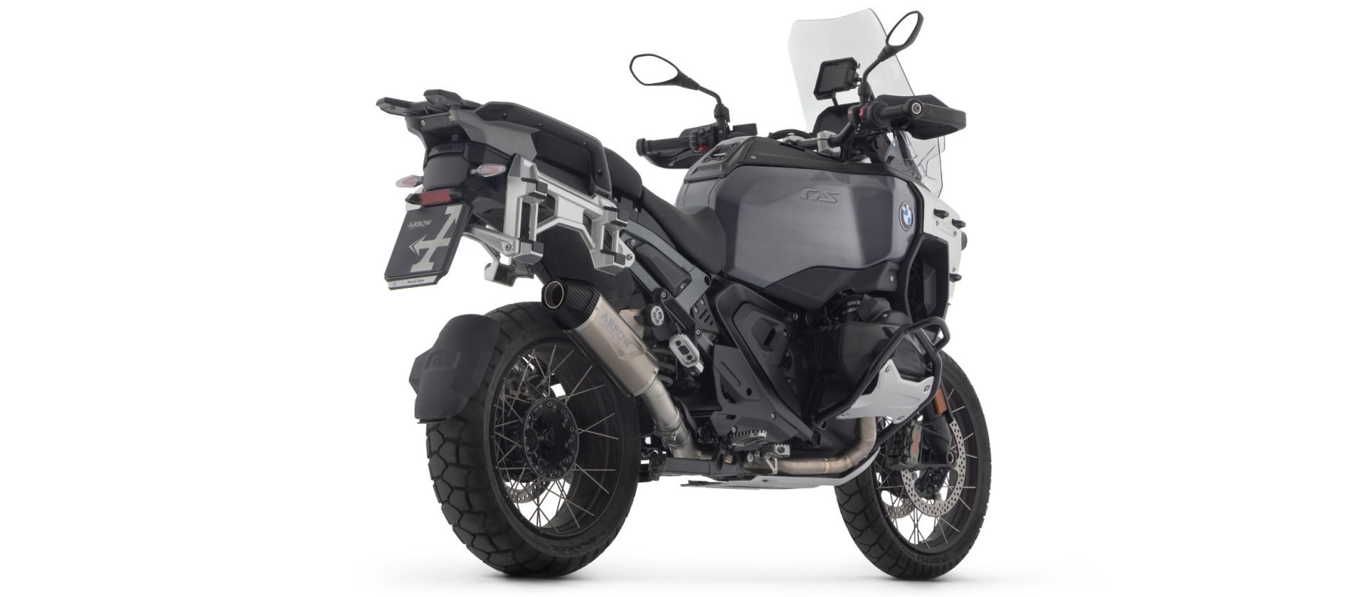 Descoperă toba finală ARROW INDY RACE EVO cu finisaj din titan și capăt din carbon. Compatibilă cu BMW R1300GS Adventure 2024, oferă un sunet profund, greutate redusă și un design sportiv. Omologare rutieră EC/ECE.