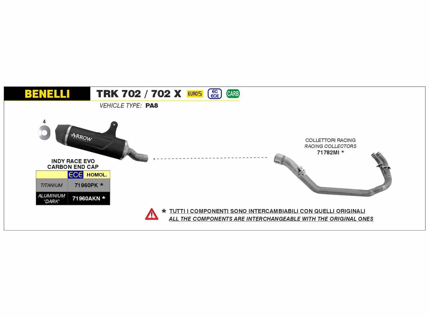Galerie de evacuare ARROW Racing (fără catalizator), din oțel inoxidabil. Pentru Benelli TRK 702 / 702 X, tip PA8, începând cu anul modelului 2023-