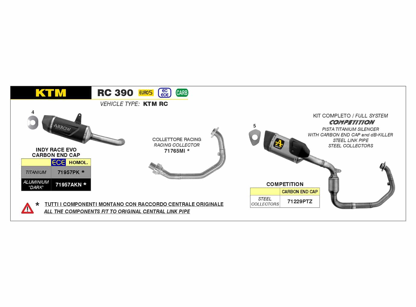 COMPETIȚIE CU SĂGEATĂ Sistem complet cu tăietor final ARROW PISTA cu carcasă din titan și capac din carbon, cu tub intermediar din oțel inoxidabil și colector din oțel inoxidabil, cu dB-Killer fără omologare pentru drumuri pentru KTM 390 RC, tip KTM RC, începând cu anul modelului 2022-